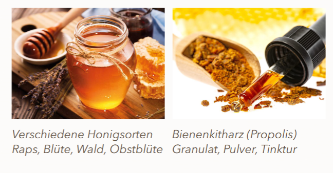 Z.b: Honig, Blütenpollen, Propolis, Gelee Royal, Salben, Bienenwachs,